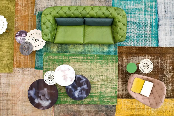 Taking on capitonné, Patricia Urquiola reinterprets it in an original way, revolutionizing the concept. Patricia Urquiola designed a family of products whose form seems liquid, as if melting over the frame, creating soft, enveloping, almost casual lines, where the fabric or leather is attached to the shell with snaps. The object appears to be wearing a shawl over its shoulders, with a series of various cushions layered over the seat: an almost obsessive search for the upholstery, a rich juxtaposition of different leathers and materials, colors, and fabric textures. A sort of luxurious patchwork that, when worn, gives the object a nomadic, global feel. Fire-retardant cold-foamed foam frame with internal resin structure. Powder-coated steel base. The Bohemian collection covers are removable.