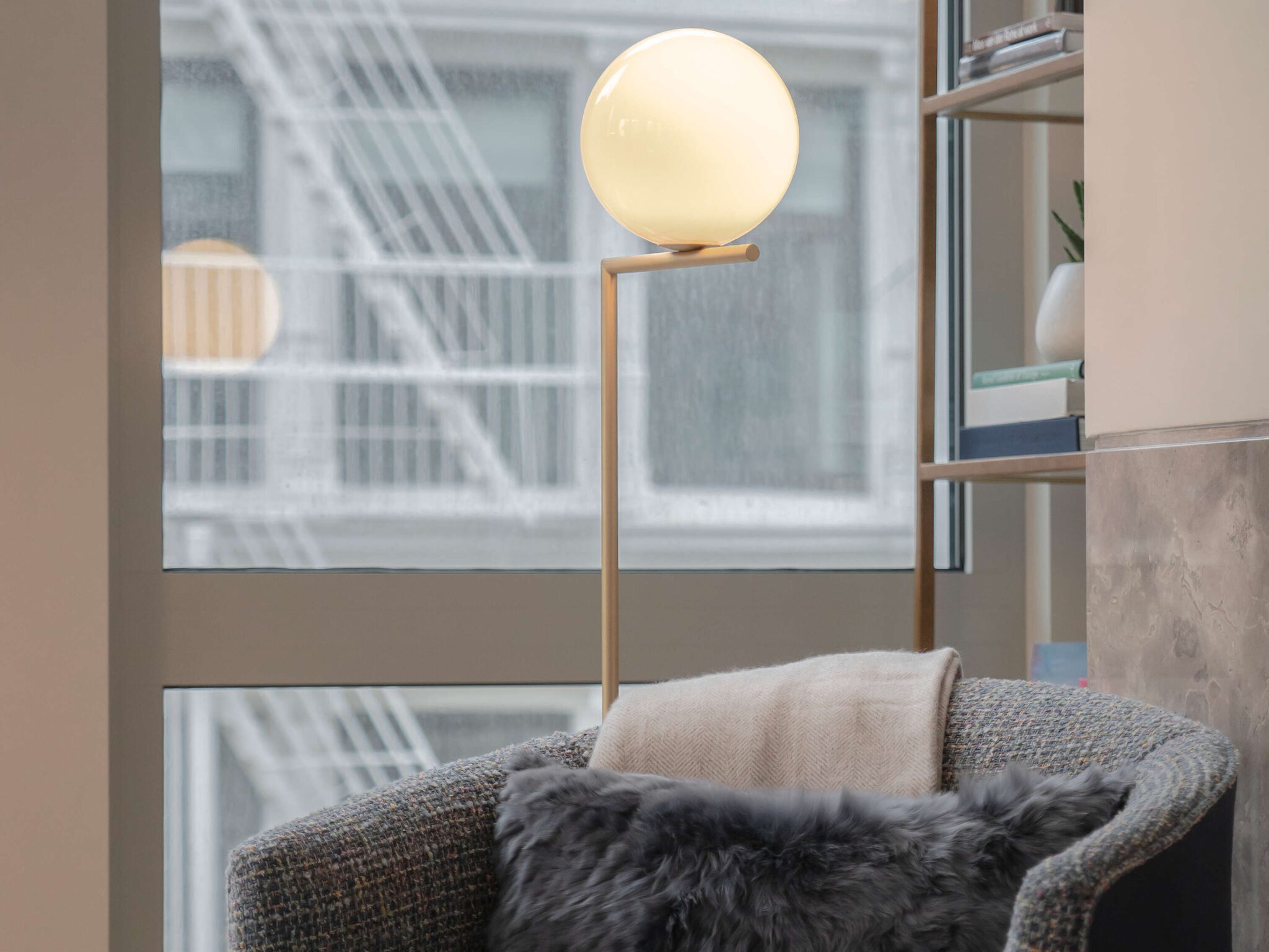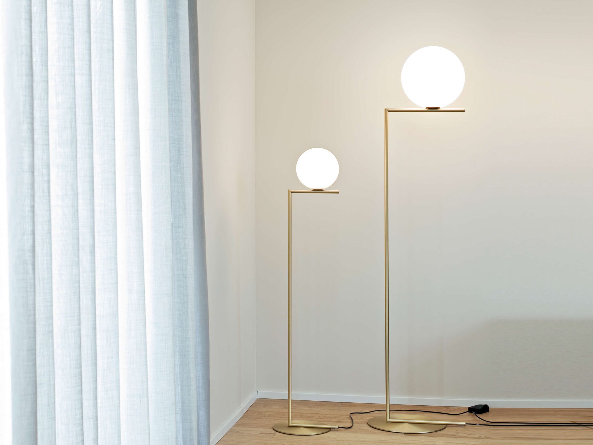 Floor lamp providing diffused light. Frame in brass, brushed and transparent varnished or chrome steel. Blown glass opal diffuser. Dimmer on the power chord.