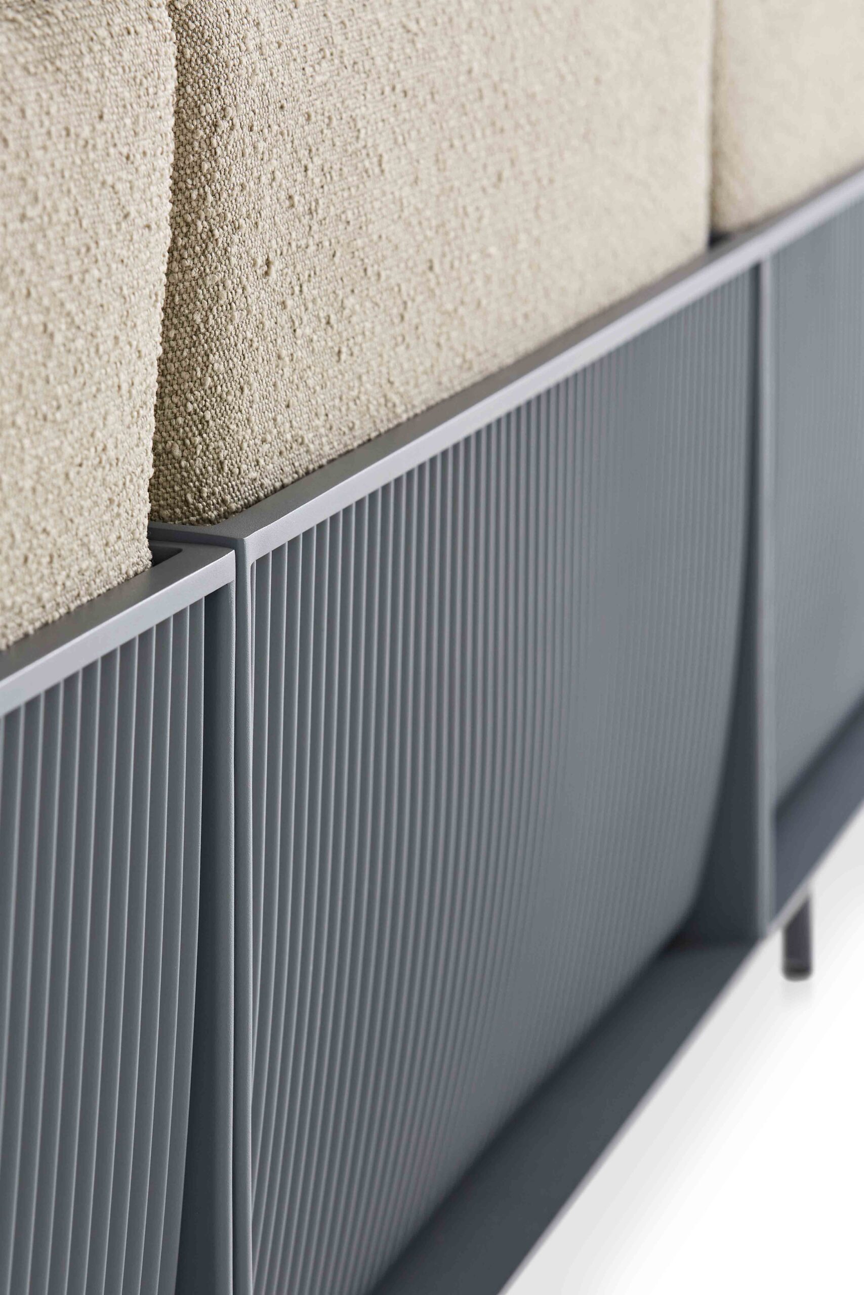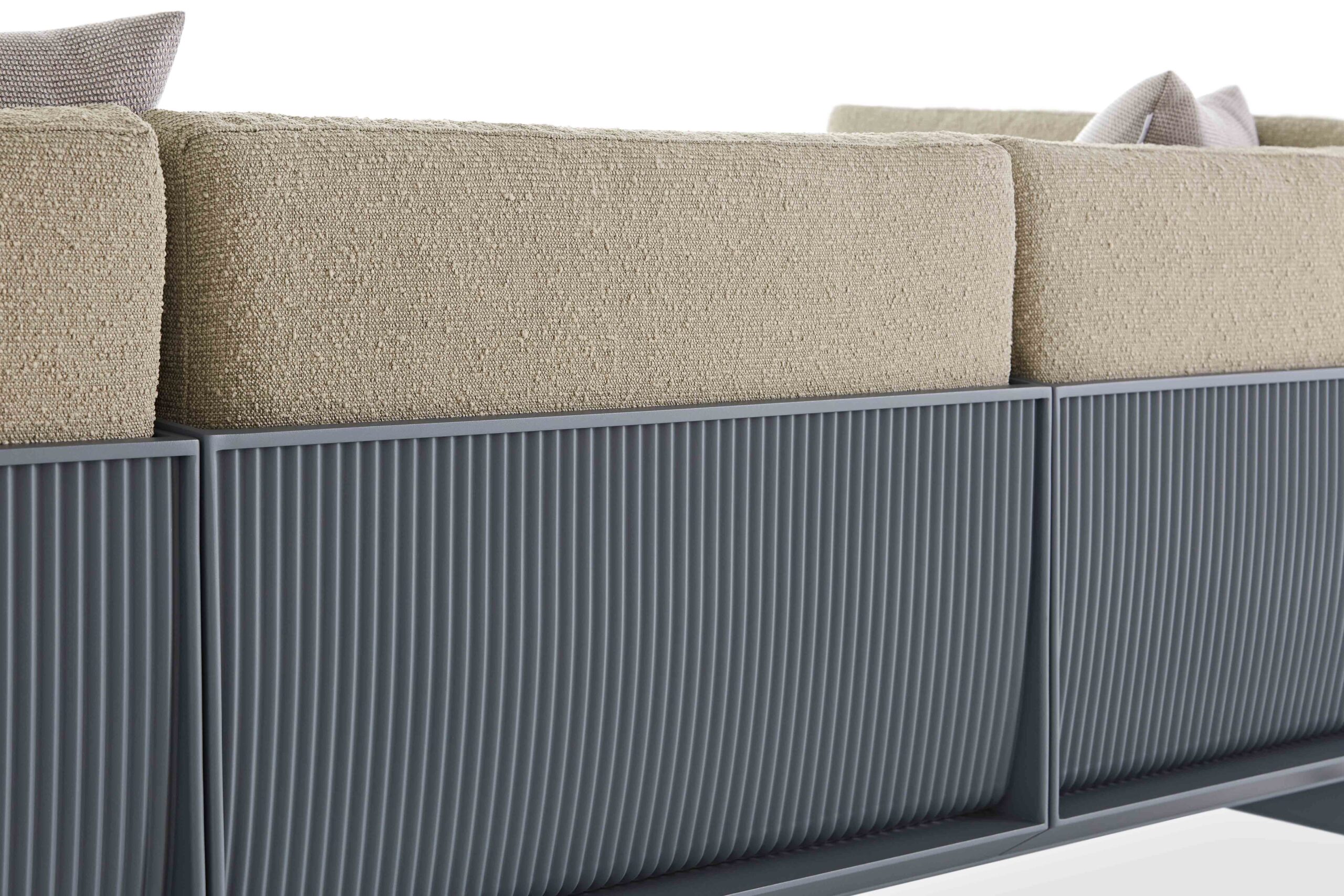The importance of comfort and painstaking attention to detail. The ONDE 3 seat designer sofa is one of the most representative pieces of the series. Made of welded corrugated aluminium sheet, the precision of its finishes and the comfort of its cushions convey the warmth inherent of indoor sofas, with the durability and resistance of outdoor materials. The base structure of the outdoor sofa, made of powder-coated aluminium, can be personalised with a special copper leg finish. You can also choose from the colour ranges proposed by Luca Nichetto as well as those available at GANDIABLASCO.