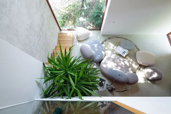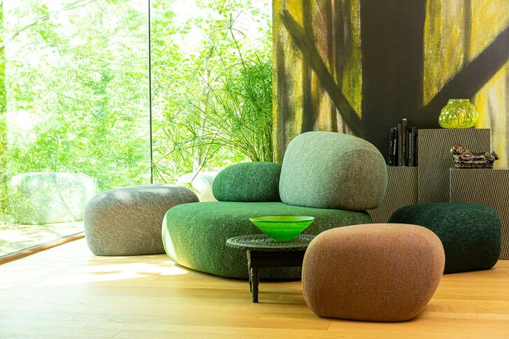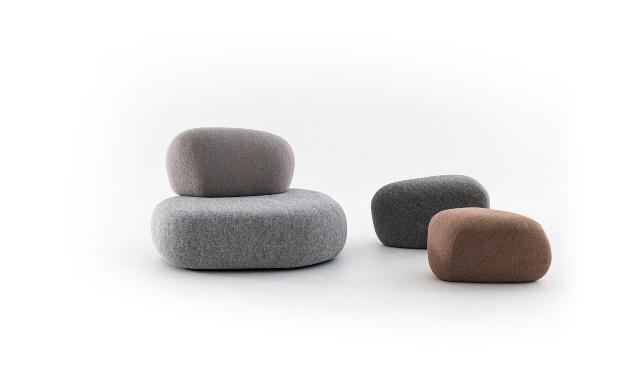 Let’s imagine standing before a powerful and mysterious work, composed of enormous, heavy blocks of stone that—in a time far removed from our own—someone gifted with superhuman strength lifted and positioned, creating seats of megalithic appearance. Let’s imagine all this happening in an unexpected place—at the entrance to a bank, in a hotel lounge, or in a library—in any case, in a context different and distant in terms of urban density and formal language. Let’s imagine, finally, moving closer, touching the surfaces, and only then being amazed by their softness. The Pebble Rubble system , designed by Swedish designers Sofia Lagerkvist and Anna Lindgren of Front Design for Moroso , expresses, first and foremost, a sensorial experience. A pleasant illusion that attracts and intrigues us, altering not only our senses but also our perception of time: the fast and frenetic pace of everyday life, the slow and inscrutable pace of nature.